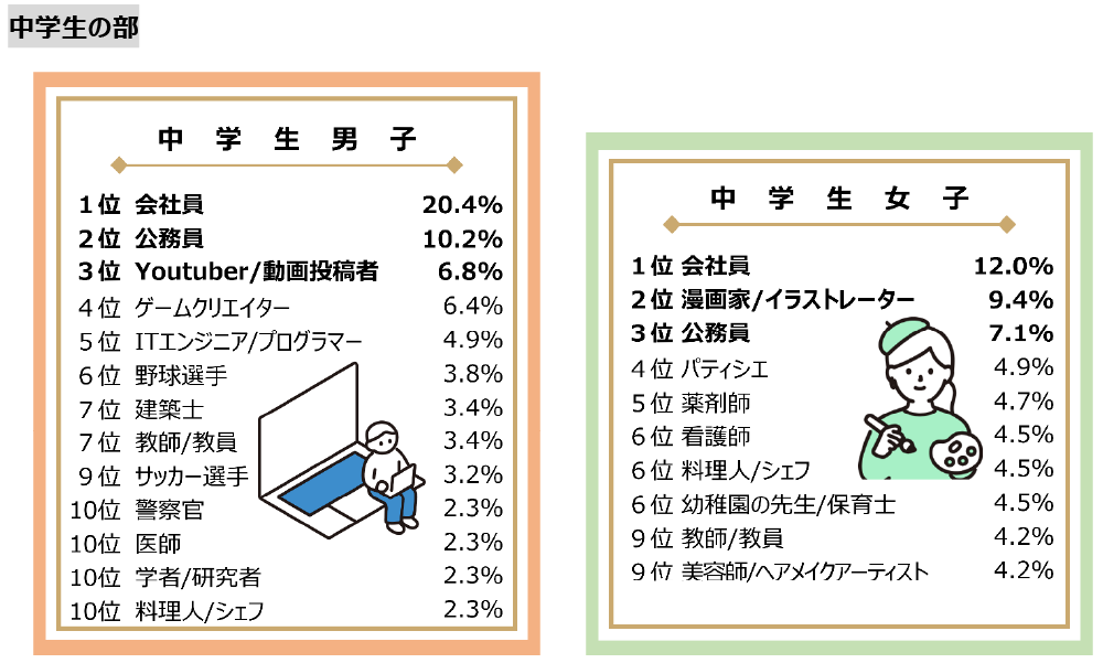 第一生命保険株式会社の「第36回『大人になったらなりたいもの』調査(2025年3月)を見ると、小学生男子の2位、中学生男子の3位に「YouTuber/動画投稿者」がランクインしていました。