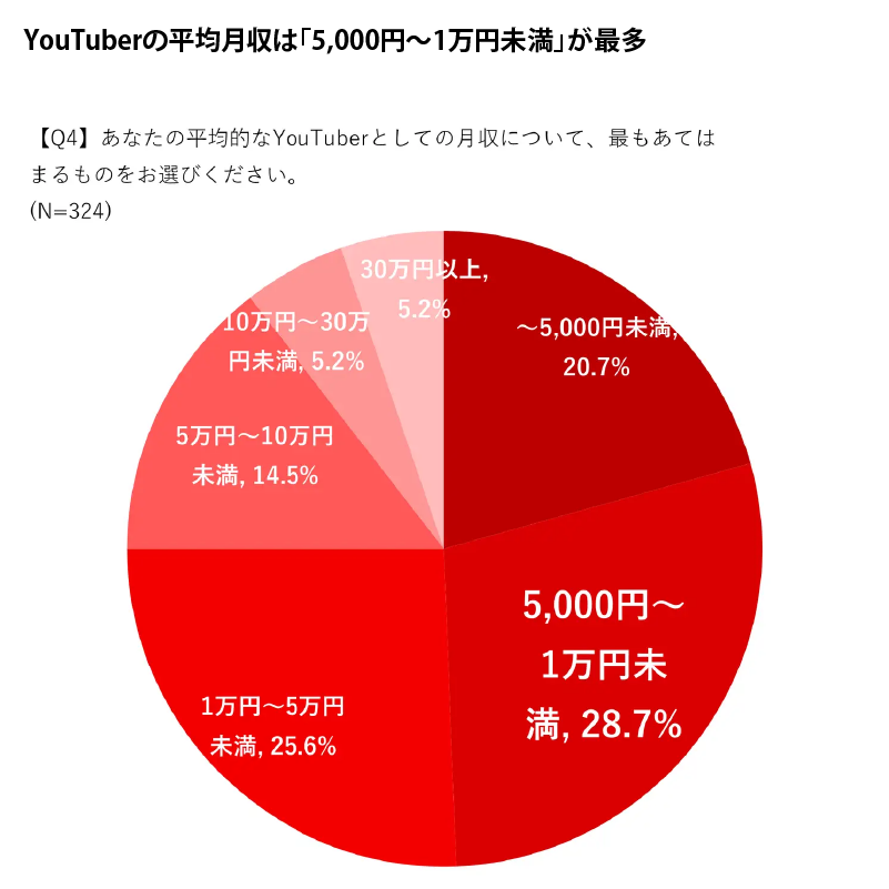 ファストマーケティングの「YouTuberに関する実態調査」(2022年4月)によると、平均的なYouTuberとしての月収は、「5,000円~1万円未満」が28.7%と最多に。次いで「1万円~5万円未満」が25.6%、「5,000円未満」が20.7%でした。30万円以上は5.2%でした。自由に使えるお小遣いが増えるくらいの収入で、これだけで生活するのは難しいようです。